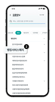 메뉴 화면 뱅킹 ▶ 뱅킹관리 ▶ 뱅킹서비스해지 클릭 후 이동합니다.